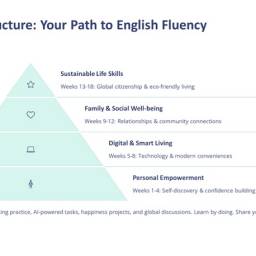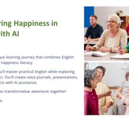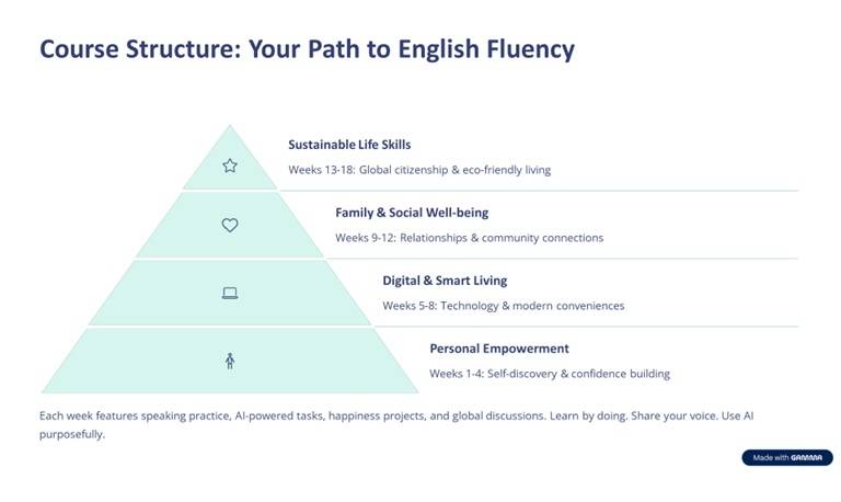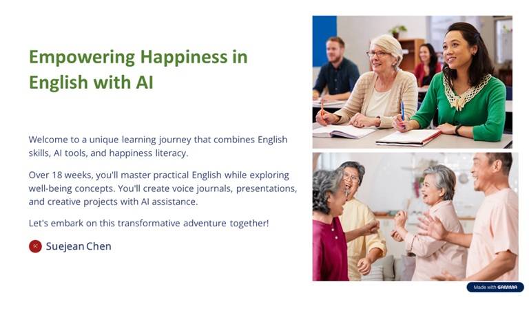 | Week 1|幸福感知力 Happiness Awareness 感受生活小確幸,練習正向英文表達 Feel everyday happiness and express it in English. | • 目標: 用英文表達情緒與生活感受 • AI任務: 使用 ChatGPT + TTSMaker 製作「My Happy Day」語音日記 • 英文時事: Gratitude around the world • 主題單字: 1. gratitude(感恩) 2. contentment(滿足) 3. well-being(安適) 4. perspective(觀點) 5. affirmation(正向語) 6. mindset(心態) |